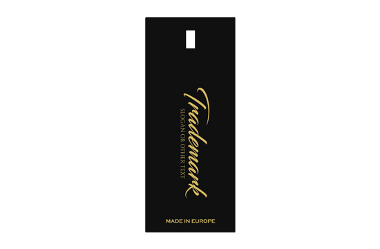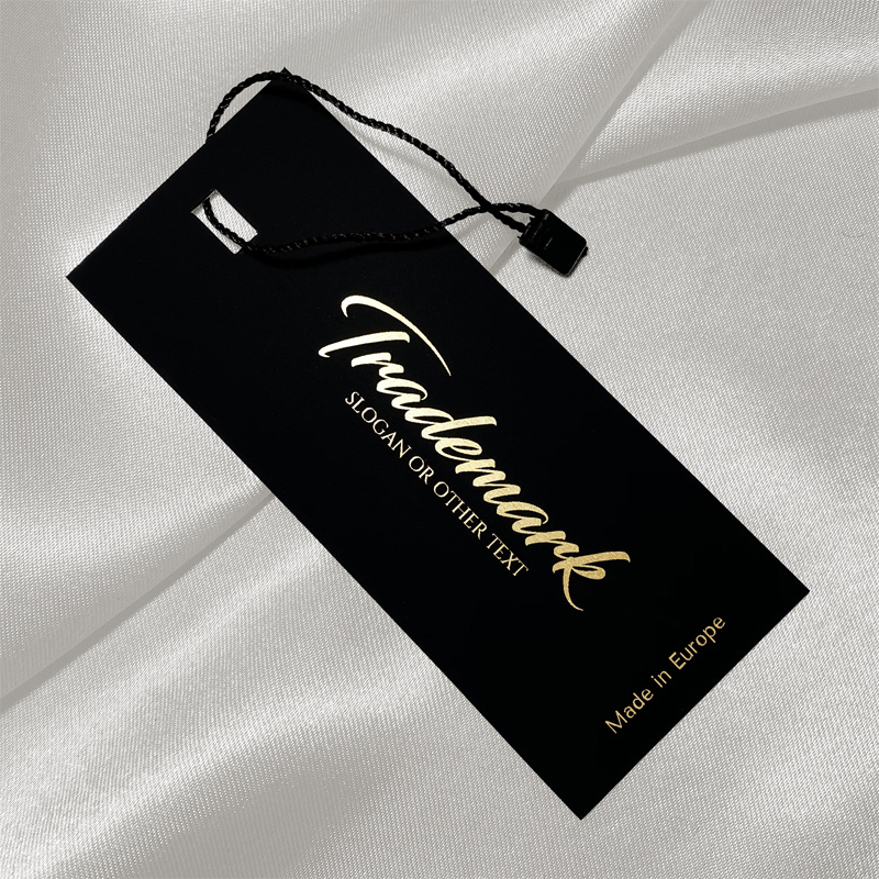 Etiqueta con cordón para colgar ropa u otros productos de confección, fabricada en cartón grueso laminado con foil Soft Touch con escritura dorada. Este modelo de etiqueta está hecho de materiales de alta calidad, utilizando las tecnologías más avanzadas en el campo de la impresión digital y el acabado.