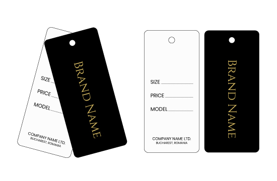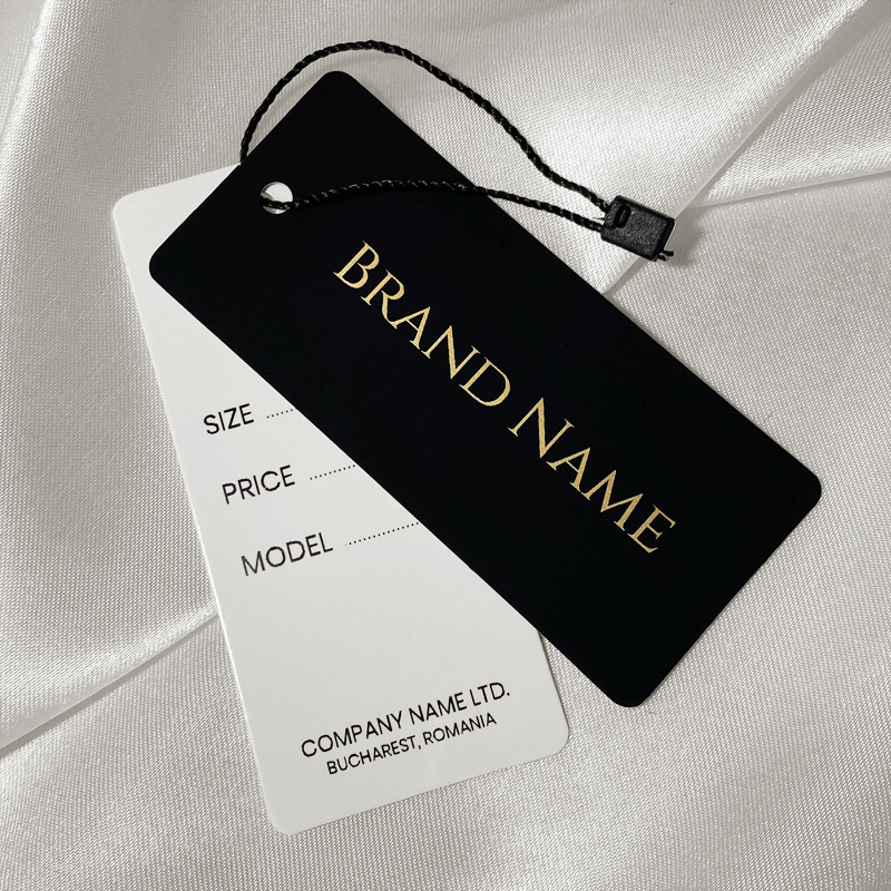 Conjunto compuesto por 2 etiquetas de cartón provistas de sello con cordon para colgar en la ropa o acceder a la ropa, fabricadas en cartón grueso plastificado e impresas con texto dorado y negro. Este modelo de etiqueta está hecho de materiales de alta calidad, utilizando las tecnologías más avanzadas en el campo de la impresión digital y el acabado.