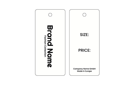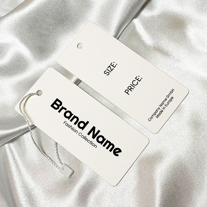 Etiqueta de cartón con cordón para colgar en la ropa o diversos complementos de vestir, personalizada con el nombre de la marca o logo, pero también otra información del producto, con impresión por ambas caras. Este modelo de etiqueta está hecho de materiales de alta calidad, utilizando las tecnologías más avanzadas en el campo de la impresión digital y el acabado.
