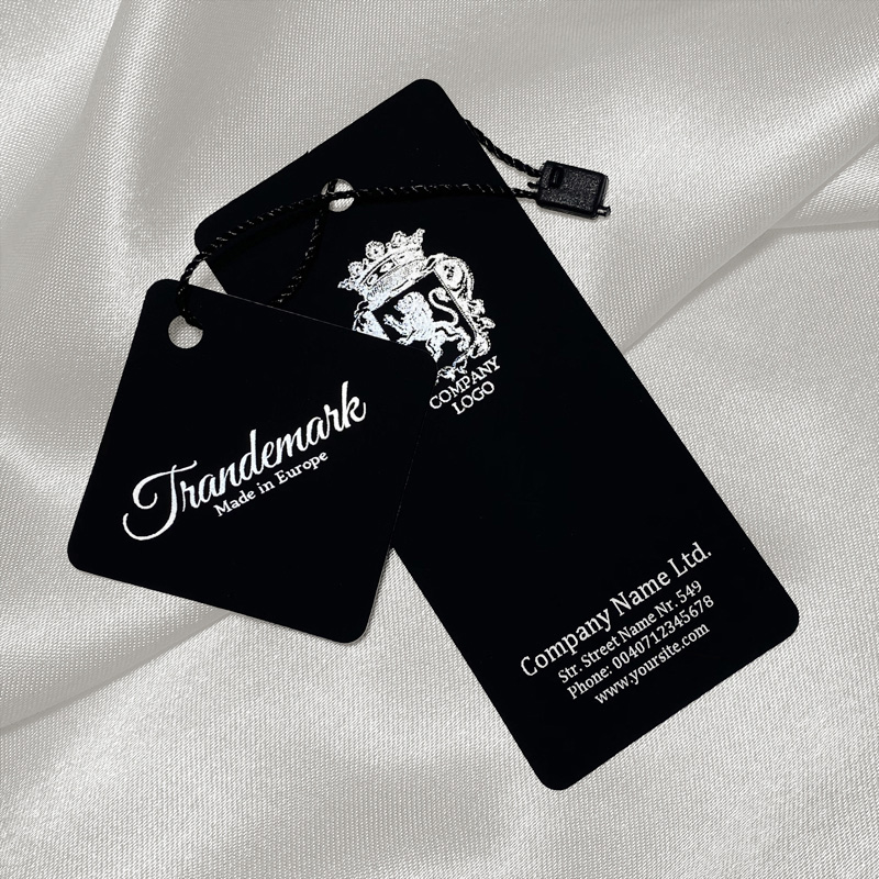Set compuesto por 2 preciosas etiquetas de cartón con cordón y sello para ropa, fabricadas en cartón laminado Soft Touch negro y personalizadas con folio tipo Digital Hot Stamp plateado. Este modelo de etiqueta está hecho de materiales de alta calidad, utilizando las tecnologías más avanzadas en el campo de la impresión digital y el acabado.