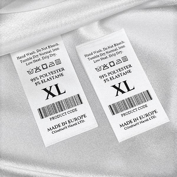 Etiqueta textil personalizada con códigos de barras, símbolos de lavado y talla, instrucciones de mantenimiento y nombre del fabricante, fabricada en fino satén blanco. Este modelo de etiqueta textil se fabrica utilizando las tecnologías más avanzadas en el campo de la impresión digital en medios textiles. Las etiquetas están impresas en satén especial, por el método de transferencia térmica, con una calidad de impresión impresionante y alta resistencia al lavado.