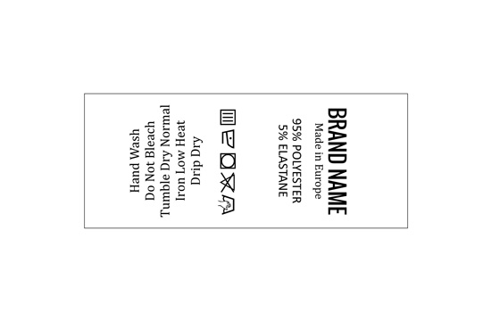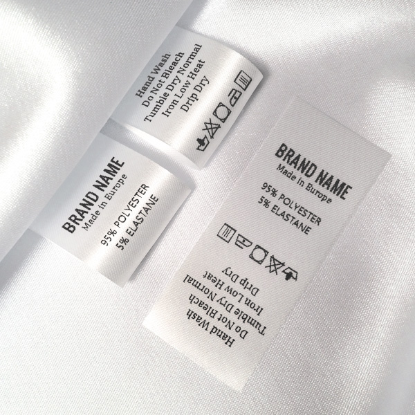 Etiqueta de composición para ropa, personalizada con textos impresos Digital en satén blanco, adecuada para cualquier producto de ropa. Este modelo de etiqueta textil se fabrica utilizando las tecnologías más avanzadas en el campo de la impresión digital en medios textiles. Las etiquetas están impresas en satén especial, por el método de transferencia térmica, con una calidad de impresión impresionante y alta resistencia al lavado.