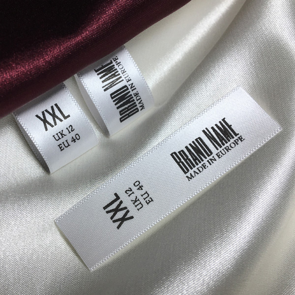 Etiqueta de tamaño impresa en satén, personalizada con el nombre de la Marca o el logotipo en la parte posterior, adecuada para ropa. Este modelo de etiqueta textil se fabrica utilizando las tecnologías más avanzadas en el campo de la impresión digital en medios textiles. Las etiquetas están impresas en satén especial, por el método de transferencia térmica, con una calidad de impresión impresionante y alta resistencia al lavado.